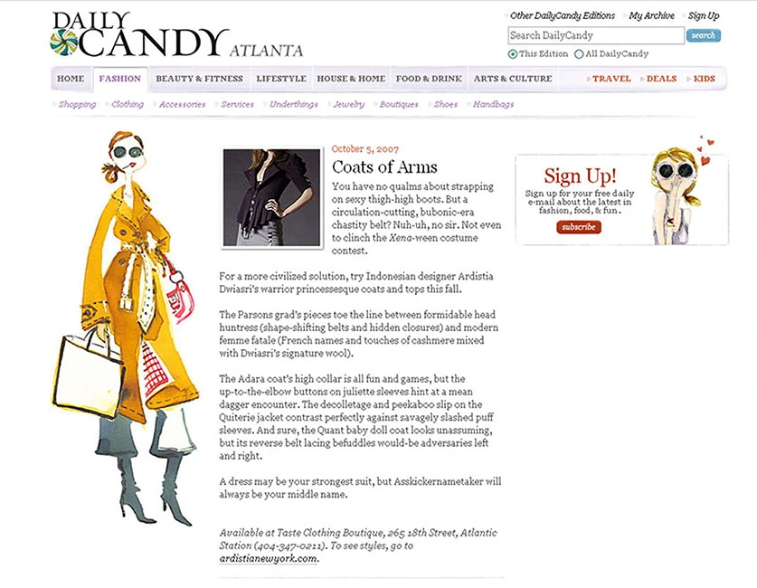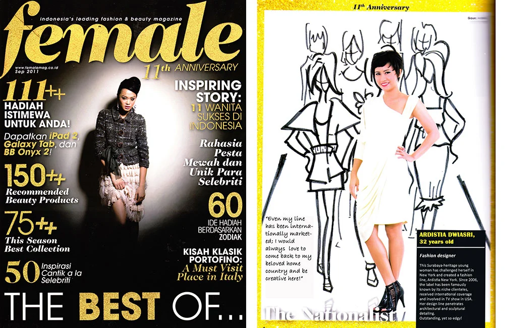 Ardistia was recently announced as a Finalist for Indonesia-Australia Center in 2014, a Nominee for the World Fashion Organization® and World Fashion Week® International, as official representative of Indonesia, February 2012, in the US, Asia, Europe. Also, as the winner of the “Are You Runway Ready” fashion contest by the Women’s Mafia, February 2010 and a finalist of Gen Art’s latest Fashion competition “Plastics Make it Possible” in January 2010. She received Honorable Mentions by London International Creative Competition in September 2009, announced as the winner of a Fashion Award from Biore / Gen Art in October 2007, profiled in WWD April 2007 issue for “New Designer to Watch” and received the ready to wear nomination from Gen Art Styles in May 2007, New York.